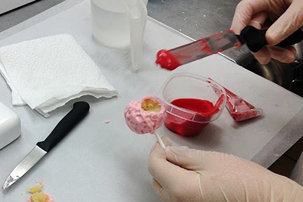 Get your melting chocolate ready for dipping and decorating. In short increments, slowly melt your white chocolate in the microwave. When smooth, set aside about 1/4 of the chocolate  to use for  your “blood.” Use a few drops of oil-based pink food color and mix thoroughly until you get a light pink shade. In the other bowl with the smaller amount, add oil-based red food color to transform it into blood.