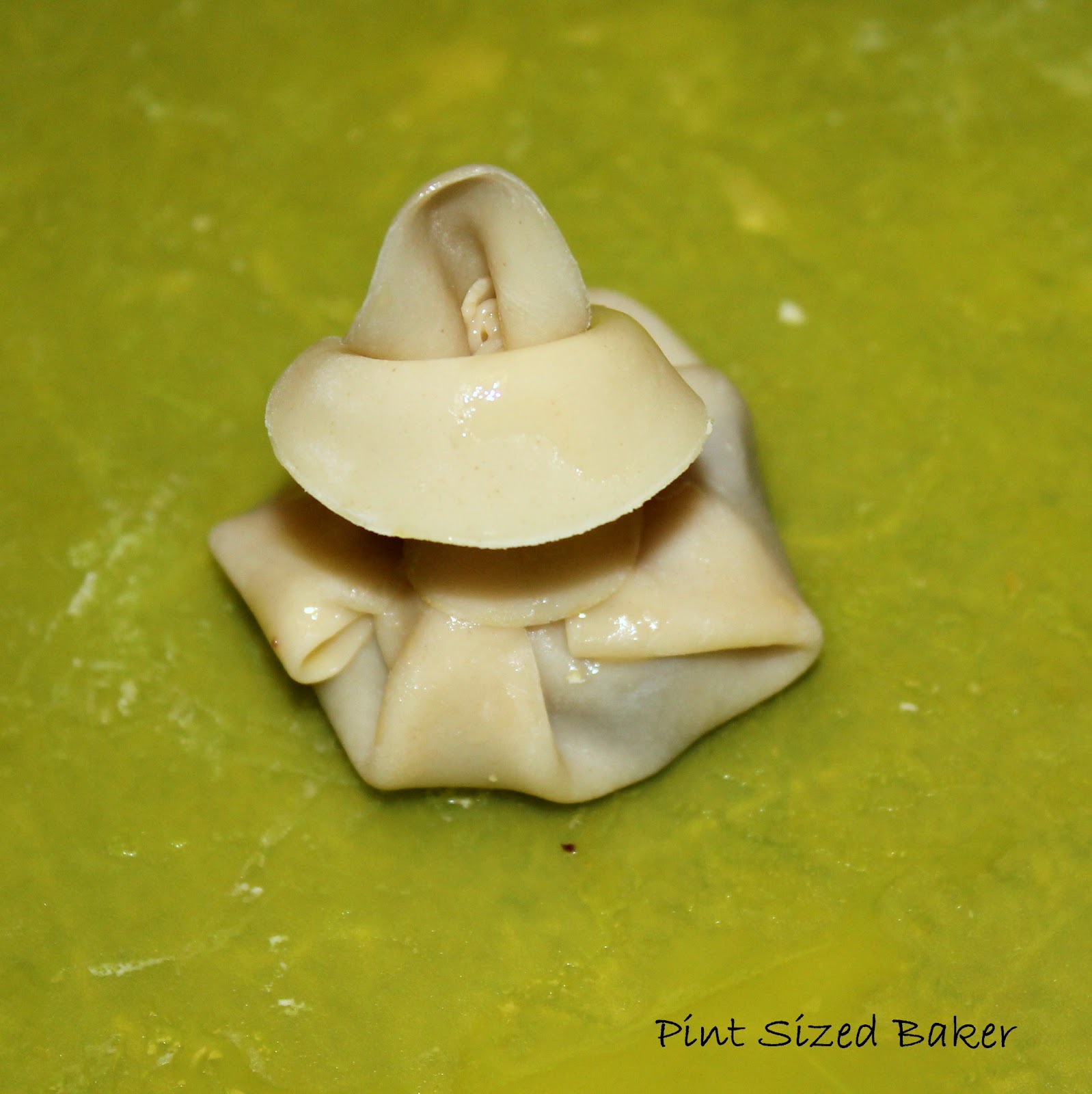 I placed the chocolate in the center of the large won ton circle and wrapped it up sealing it with the egg wash.