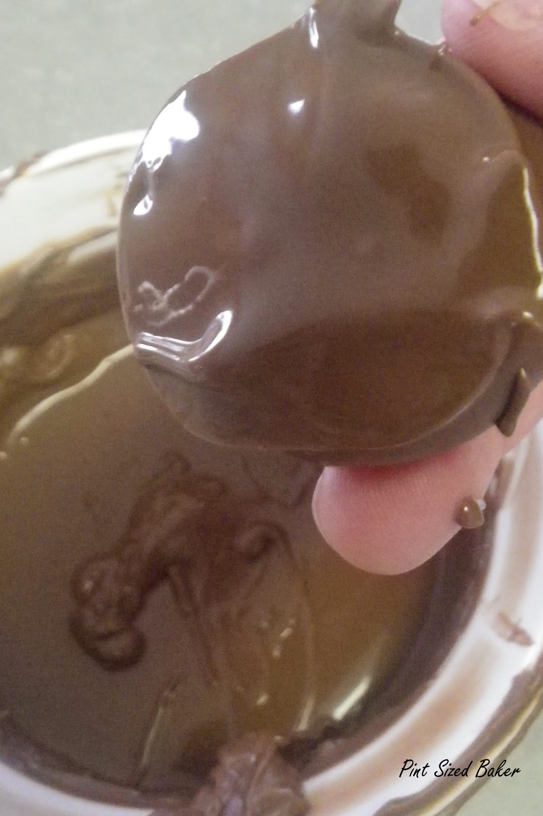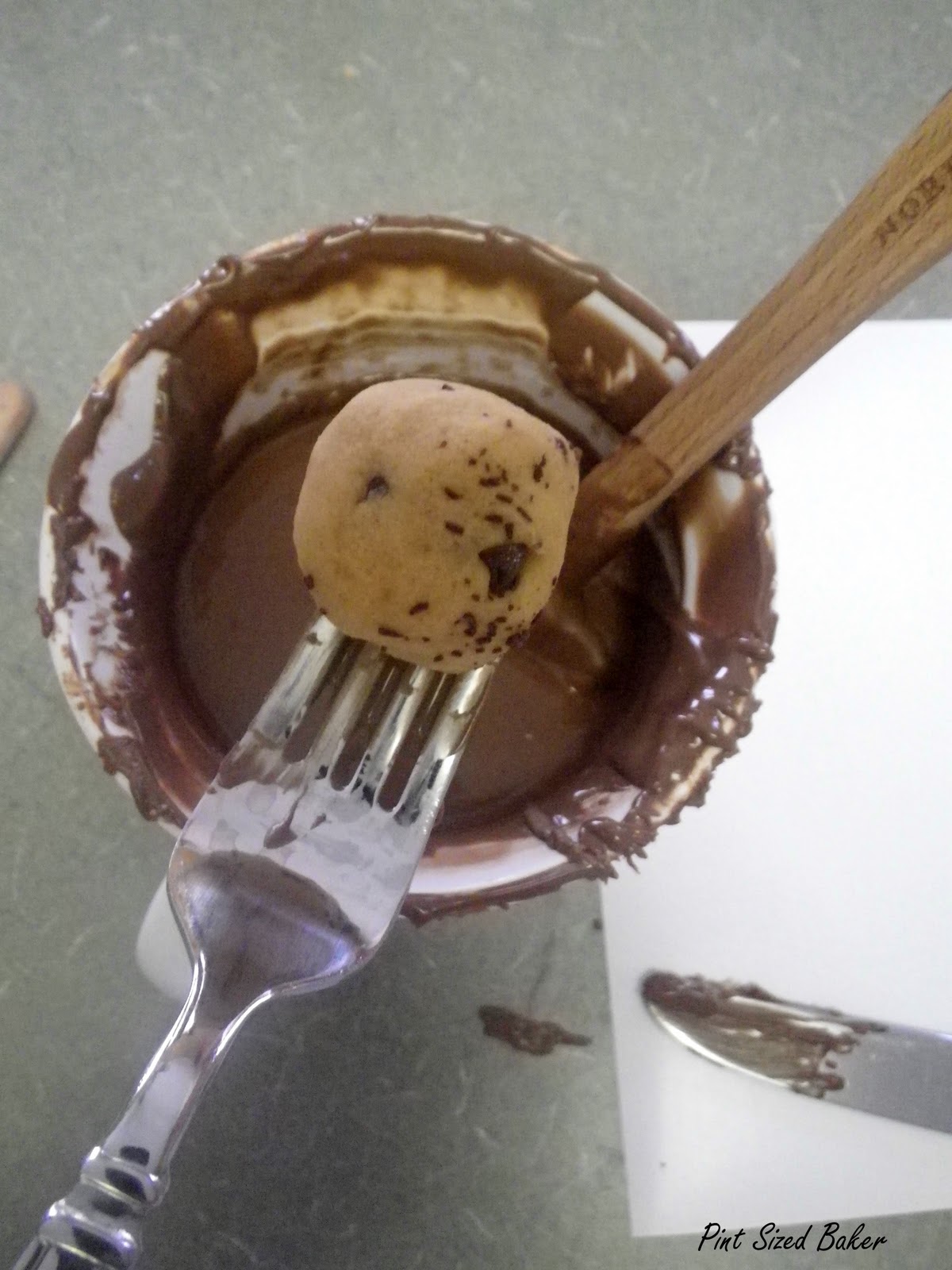 Place a dough ball on a fork and spoon chocolate over it. Tap the fork with a butter knife to smooth out the chocolate and then gently transfer the dough ball to a cookie sheet covered in wax paper. To see a video on this technique, click here for my You Tube video.