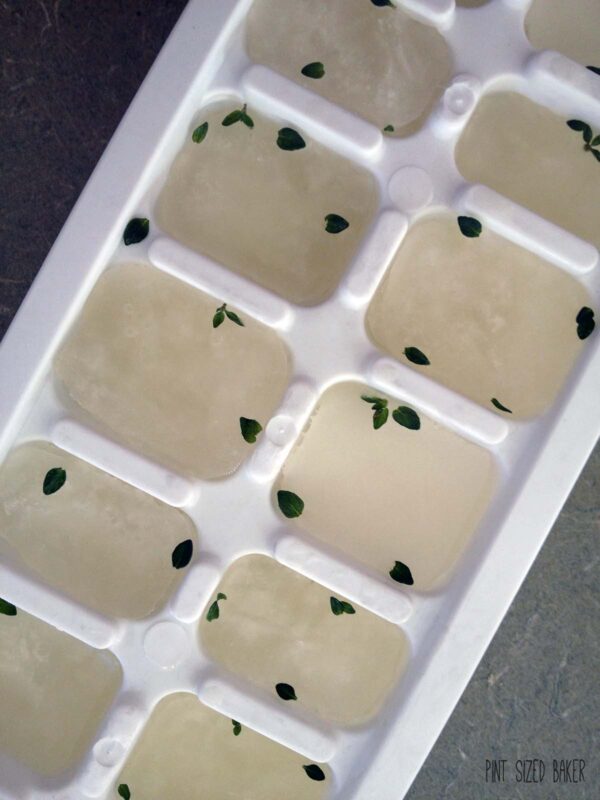 - Remove the ginger thyme ice cubes and place them into a food processor. Pulse until the ice is light and fluffy. If you are not serving it right away, place it into a shallow bowl or cake pan and return it to the freezer. Scrape with a fork to loosen prior to serving.