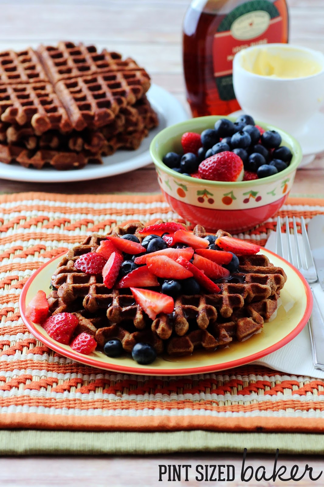 Top with butter, syrup, and fresh fruit and dig in!