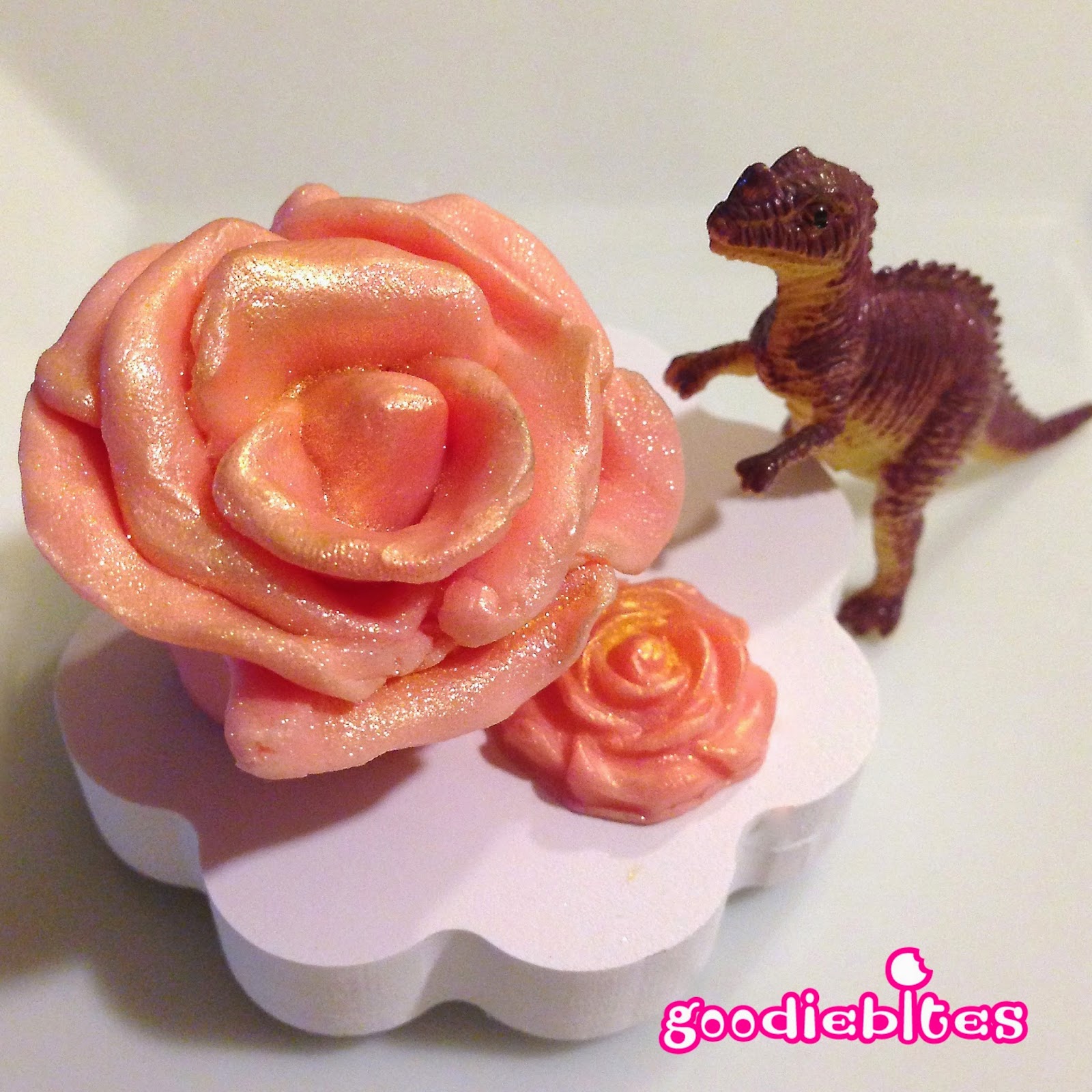 Here is a rose, painted with gold luster dust (sitting atop a single cake-pop stand from Cake Pop Stand Co. and photobombed by my Dino JoJo from Photojojo)