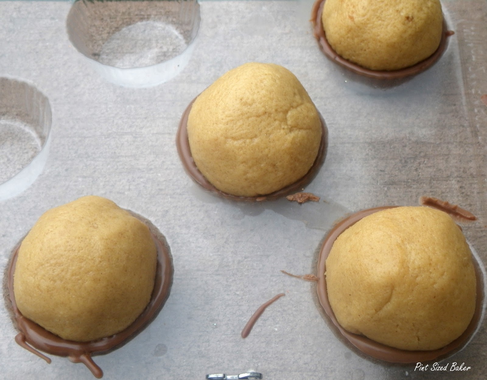 I melted peanut butter flavored candy melts in a small bowl and then dipped the top half of the dough ball.