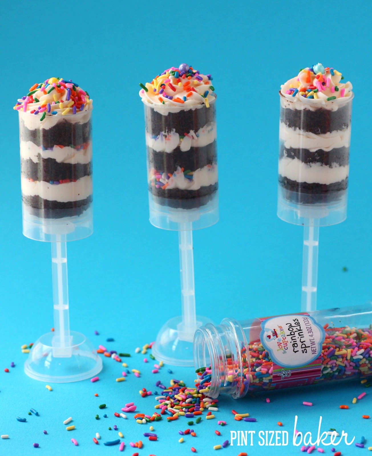Alternate cake and frosting in the container and top with sprinkles.