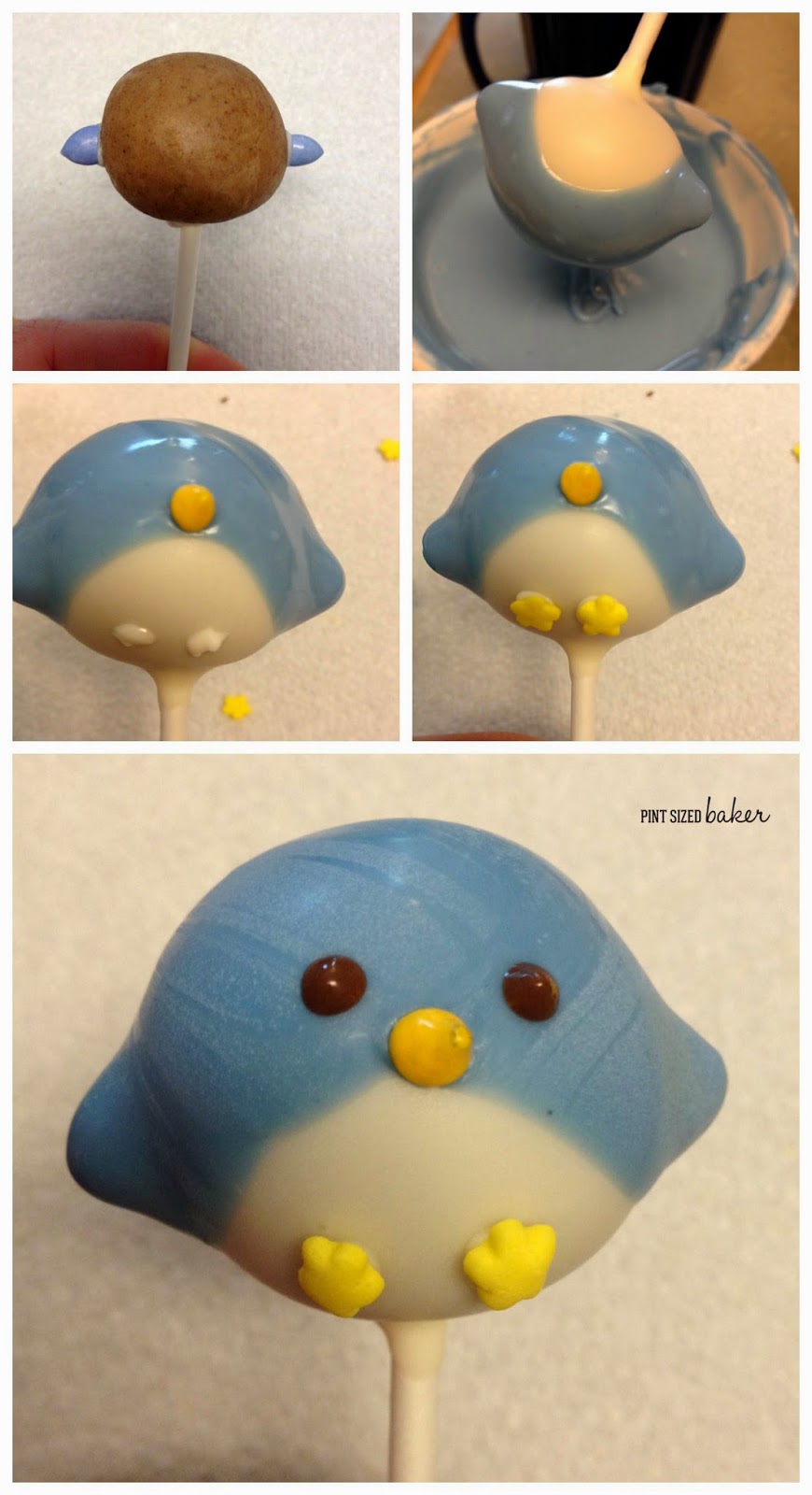 Get your blue candy melts and roll the pops from wing to wing. This should give you a nice curved chest. You could also dip at angles to get straight lines, but I liked the curve instead. Add a little beak while the candy is wet.