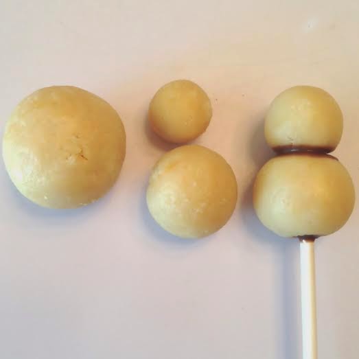 Step One – Roll out your cake ball and then split it into 2 pieces: one smaller piece which will be the body and one bigger piece which will be the head. Dip the tip of a cake pop stick into melting chocolate and slide the larger ball onto the stick so that it comes out the other end. Dip the end of the stick again into the chocolate and slide the smaller ball onto the stick so that the 2 are connected together