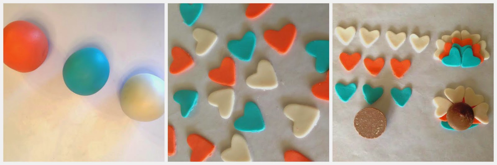 Step Three: Preparing the tail. Roll out your fondant and using your heart cutter, cut several hearts out. I used 10 hearts per turkey but you can cut less or more depending on your preference. Arrange the back layer first and using a tiny bit of water, attach the second layer and then the front layer as pictured. Let your “fan” dry for a few minutes and once it has set, attach the entire piece to a candy melt.