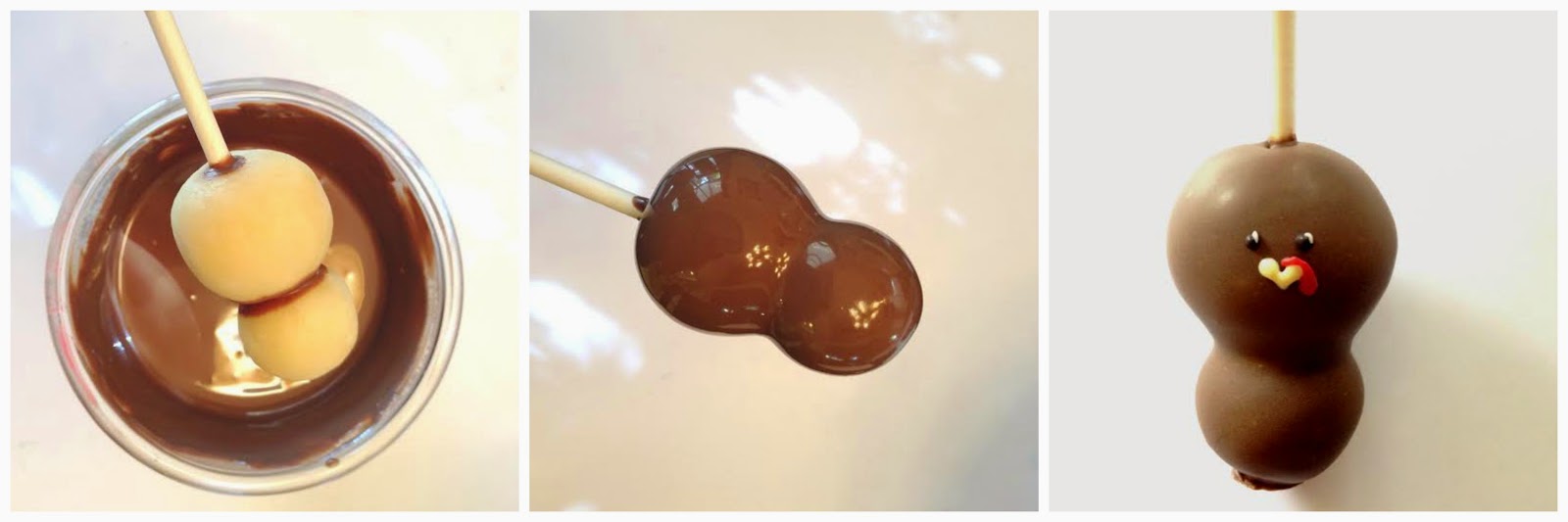 *Special note: If you prefer doing your turkeys stick down so you can place in a bouquet or stand, reverse the sizes of the cake balls so that the smaller ball goes on the stick first and the larger ball second.